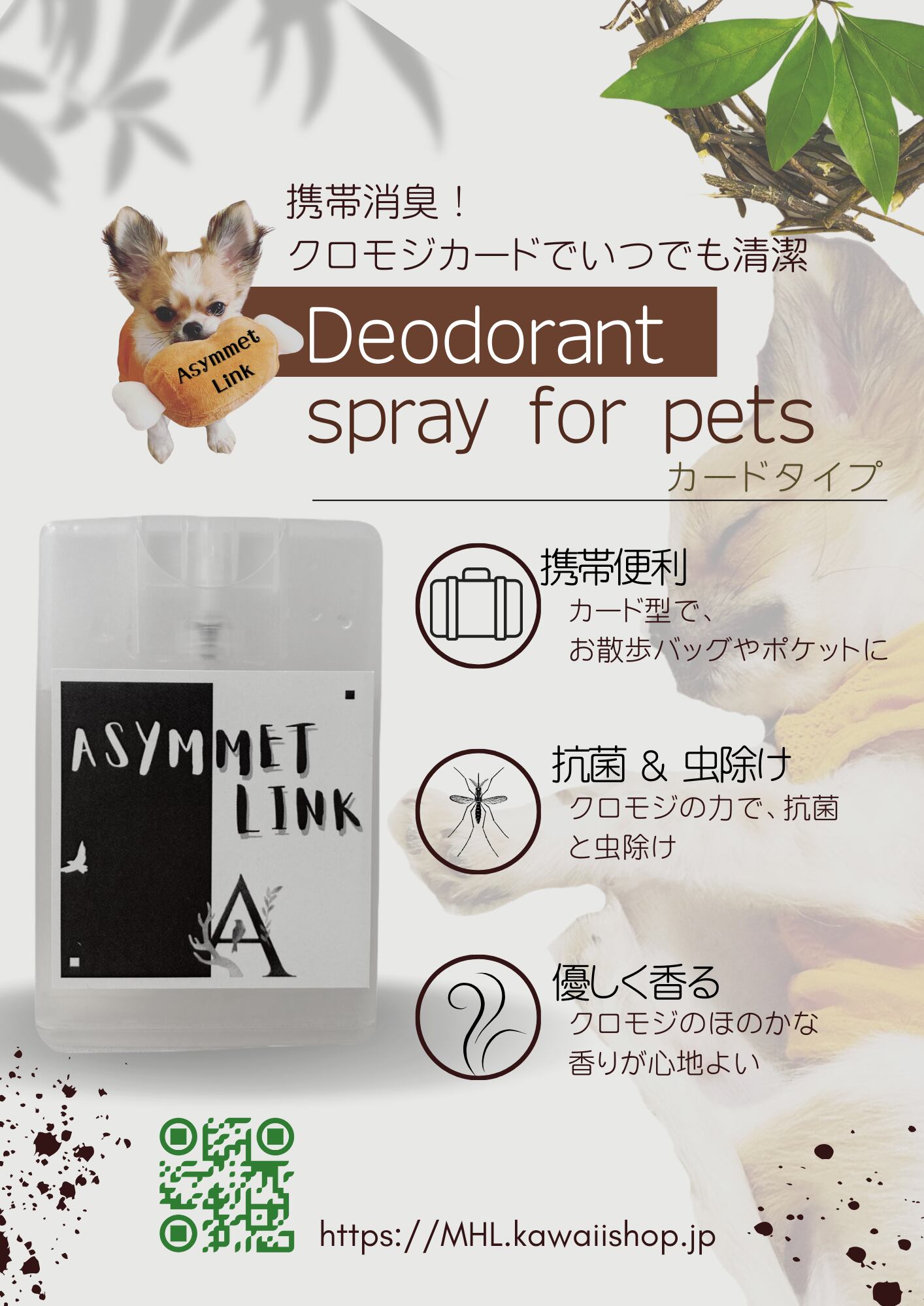 「愛犬との大切な時間を、クロモジの香りと共にお過ごしください。天然の虫除け効果で、健やかで快適な毎日をサポートできれば幸いです。」